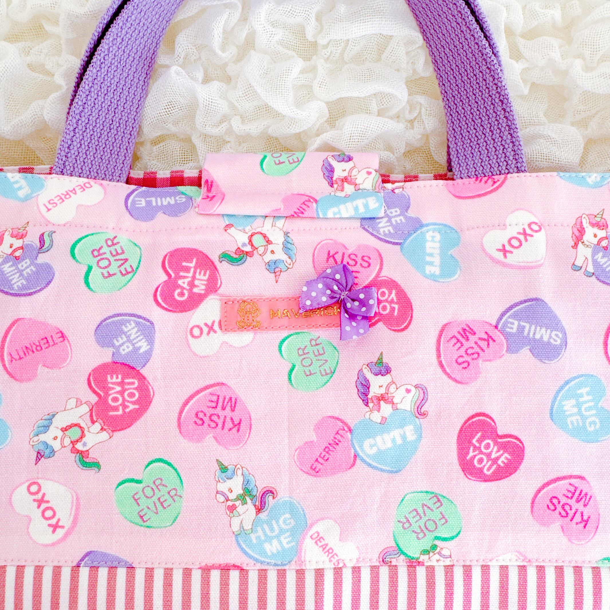 女の子に人気のユニコーン×キャンディーハーツ柄のゆめかわいい鍵盤ハーモニカバッグです。