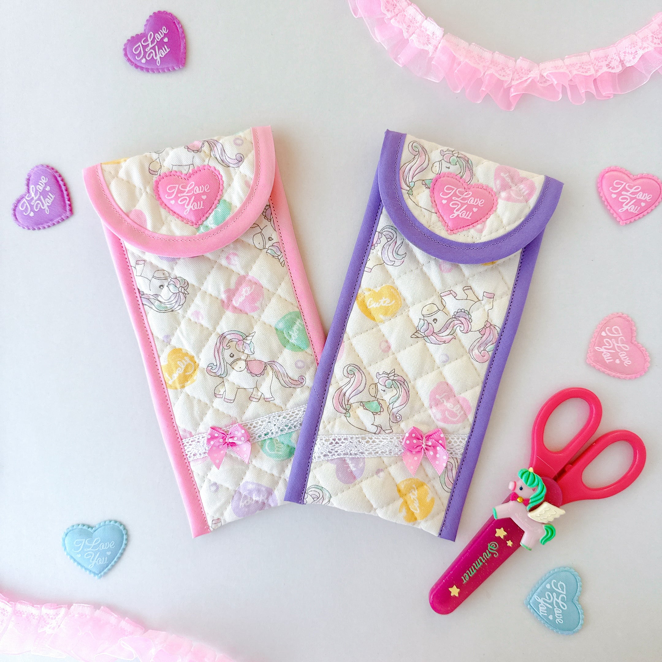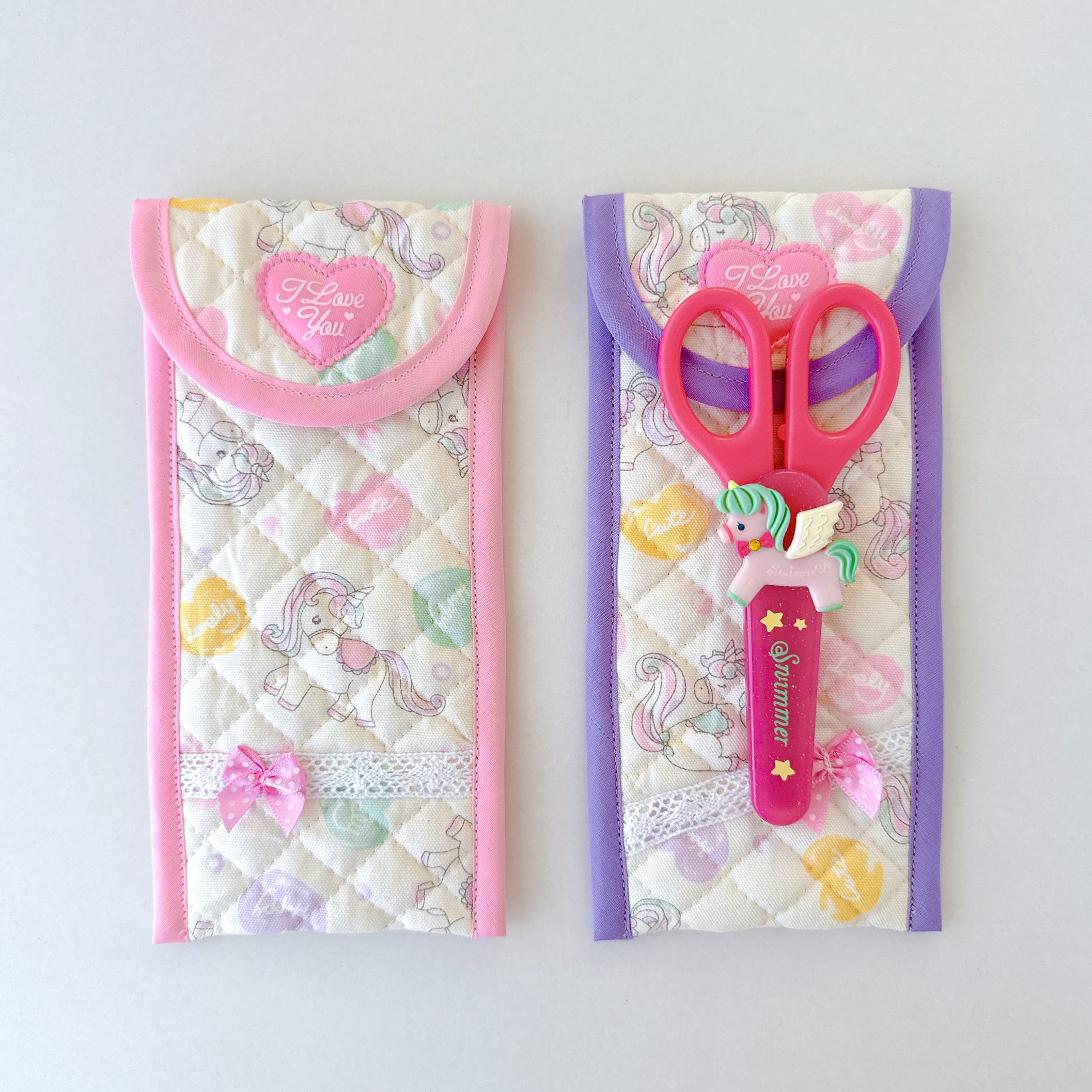 キルティング粘土ベラケース・はさみ袋『ユニコーン』カトラリーケース|はさみ入れ|ペンケース|粘土ベラ袋|ハーモニカ入れ|サイズオーダー可能|ゆめかわいい|女の子入園|ハート|リコーダー入れ