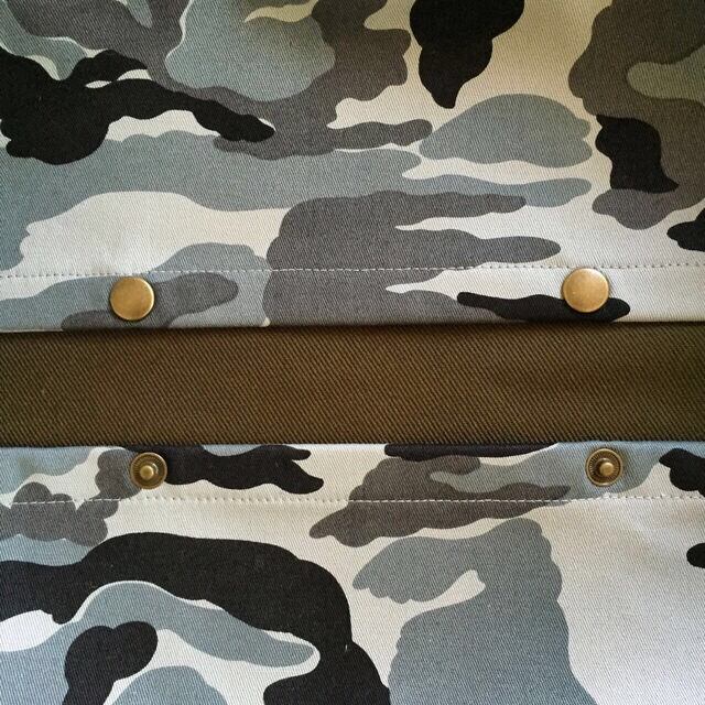 “パパが持ってもおかしくない”をテーマにグレー系の迷彩柄✕裏地にオリーブ色のカツラギデニムを使用しミリタリー調に仕上げてみました。