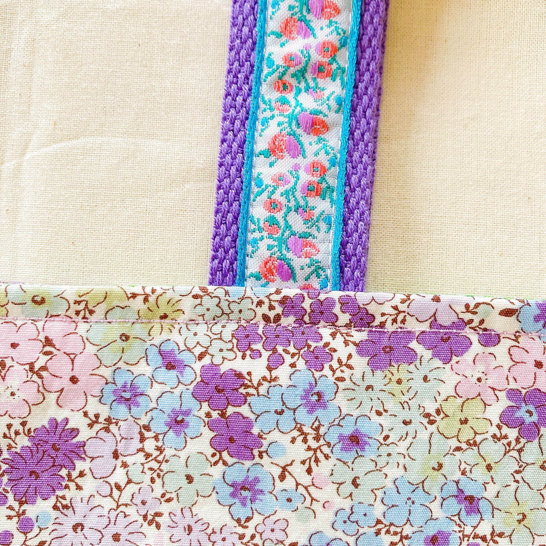 さらに持ち手には生地と同系色の花柄のレアなアパレル向けのチロリアンテープを縫い付け、どこまでもメルヘンでガーリーな仕上がりになっています。