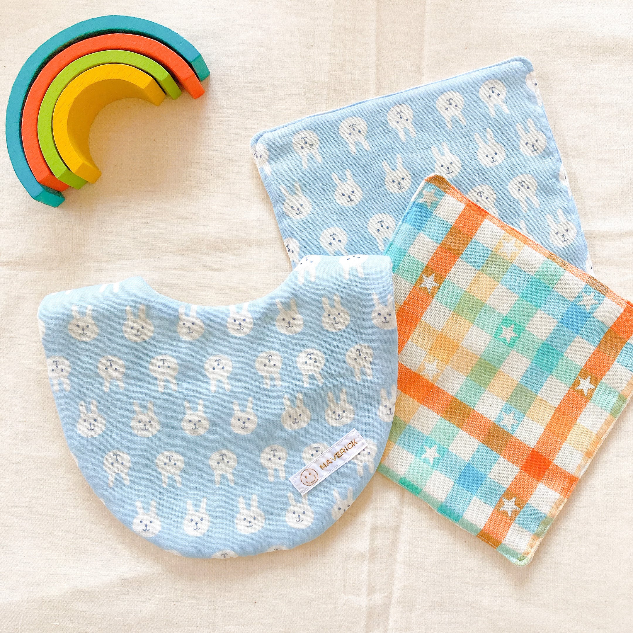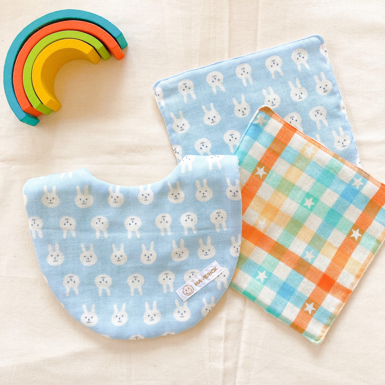 出産祝い ギフト3点セット 男の子〜ふわふわ 国産8重ガーゼのリバーシブルスタイとガーゼハンカチ2枚セット『水色ウサギ✕ドット』〜