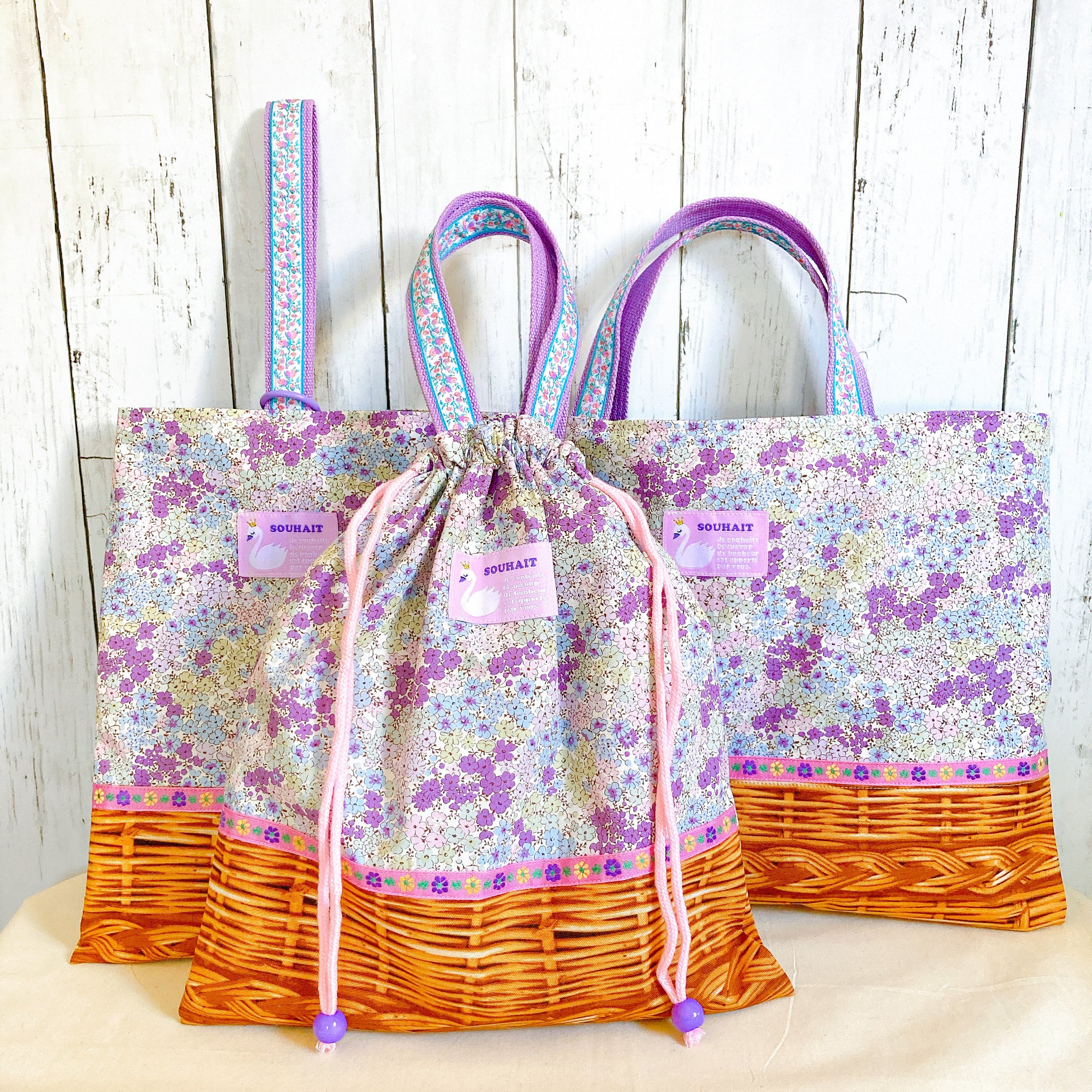 女の子 入園入学3点セット『フラワーバスケット・ラベンダー』レッスンバッグ&上履き入れ&体操着袋|パープルの裏地つき